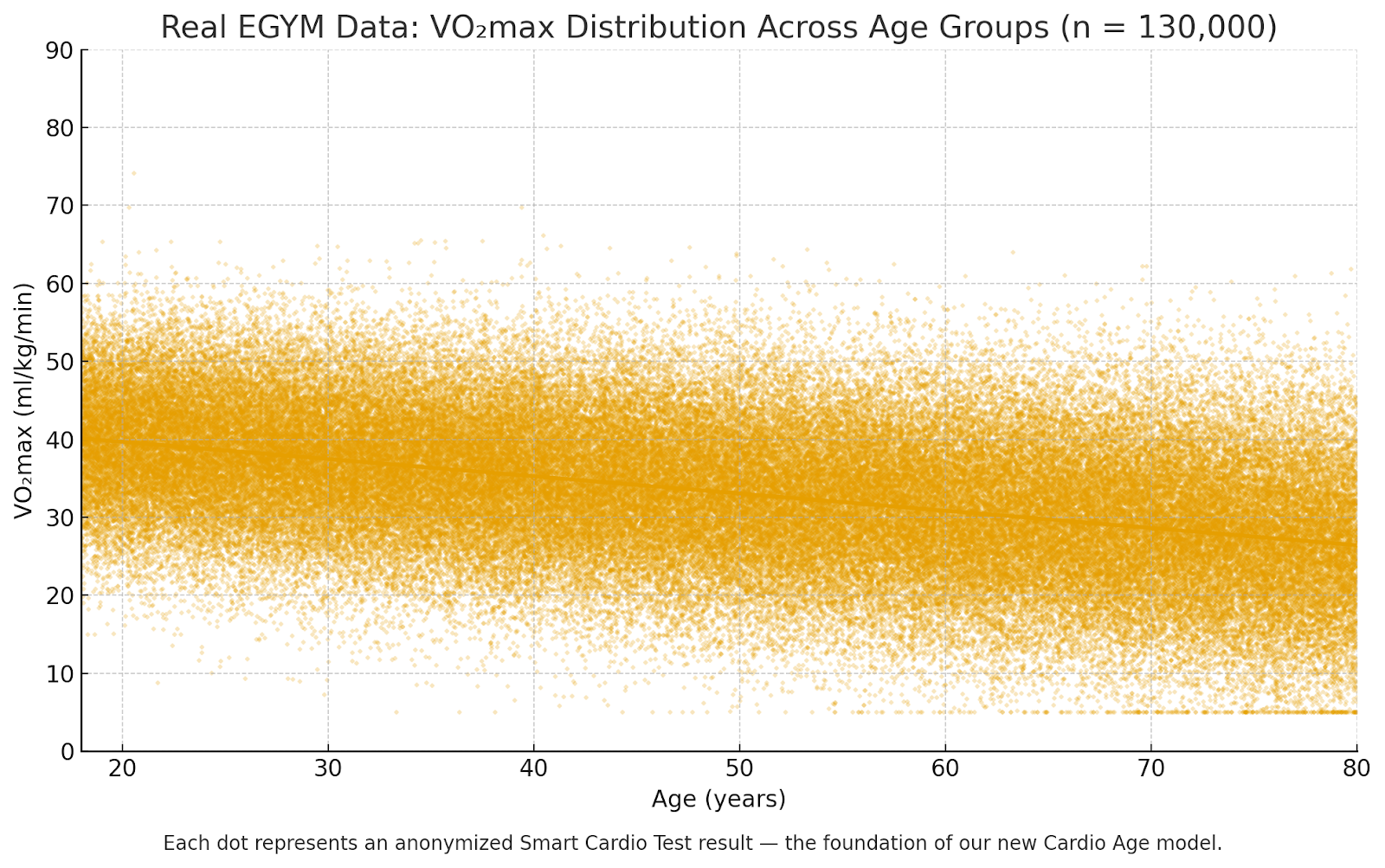 Antes de perfeccionar la fórmula de Edad de Cardio , nuestro equipo de ciencia de datos analizó 130 000 pruebas Smart Cardio realizadas por usuarios de EGYM de todo el mundo durante el último año. El siguiente gráfico muestra datos reales de usuarios; cada punto representa el resultado de una prueba individual y muestra cómo nuestro nuevo modelo se basa en patrones de rendimiento reales observados en diferentes grupos de edad.